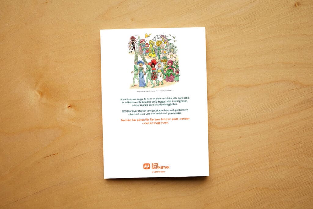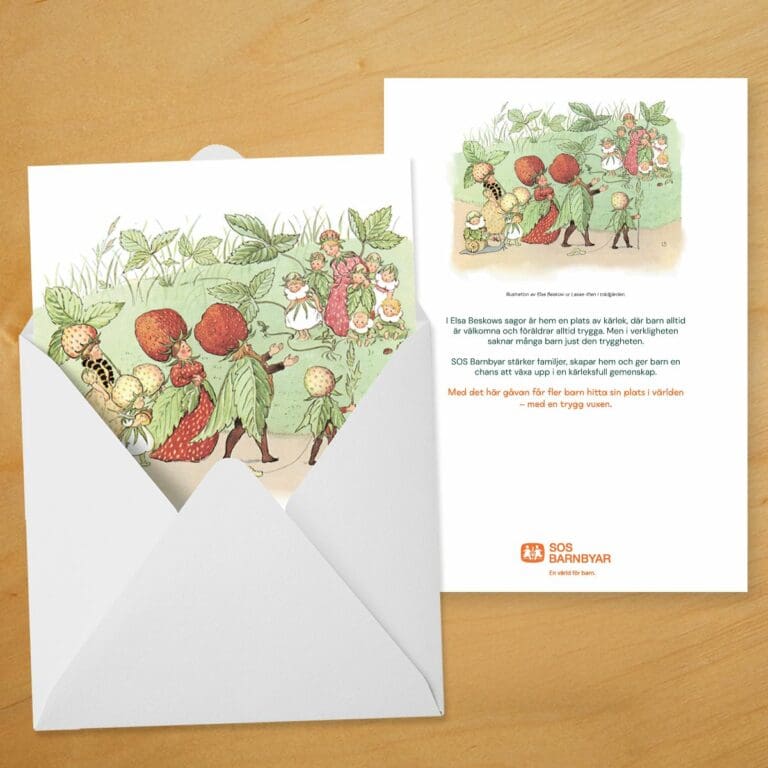 Tack vare Dag Beskow och Bonnier Carlsen har SOS Barnbyar fått möjlighet att använda några av Sveriges mest älskade motiv – Elsa Beskows tidlösa illustrationer. Genom detta unika samarbete förenas sagans kraft med arbetet för barns trygghet, och varje motiv bär med sig ett budskap om omtanke, kärlek och en bättre framtid för alla barn.